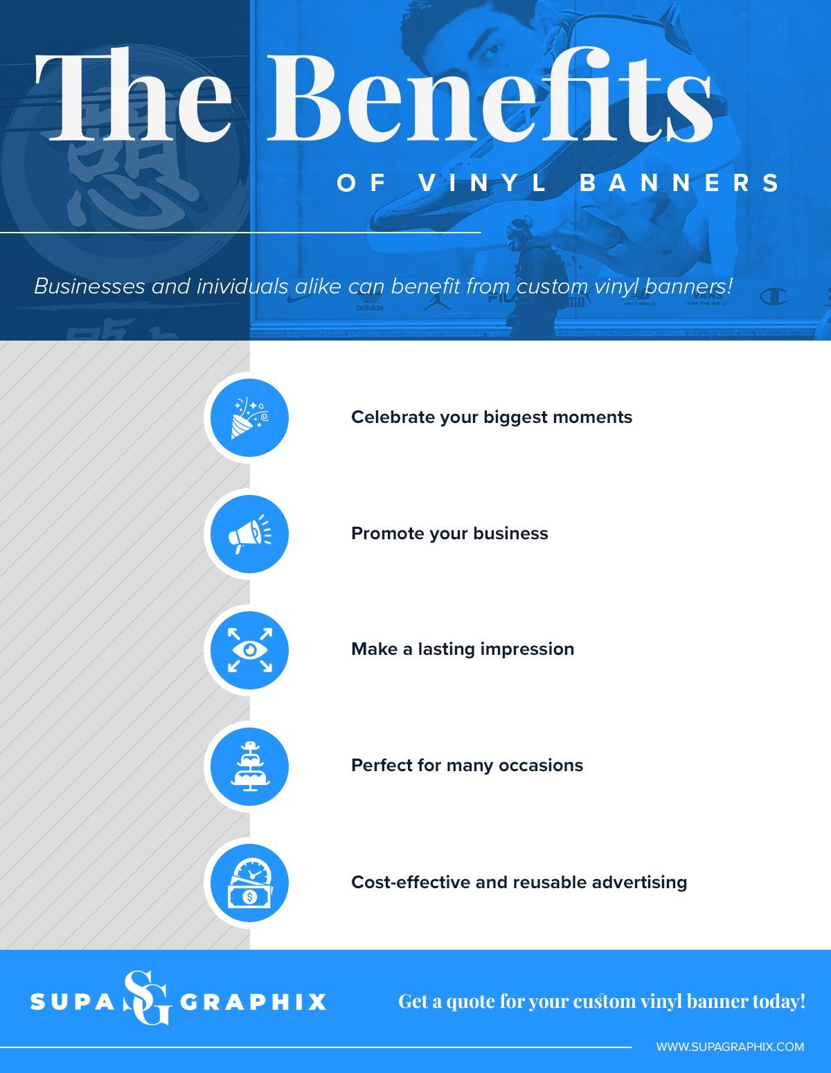 banner-icon The Benefits of Vinyl Banners Banners are an incredibly versatile marketing tool. They can be used for a grand opening, a sale, an event, or simply to advertise your business. Because banners are so versatile, they can be placed just about anywhere! Here are some of the other benefits of using banners: